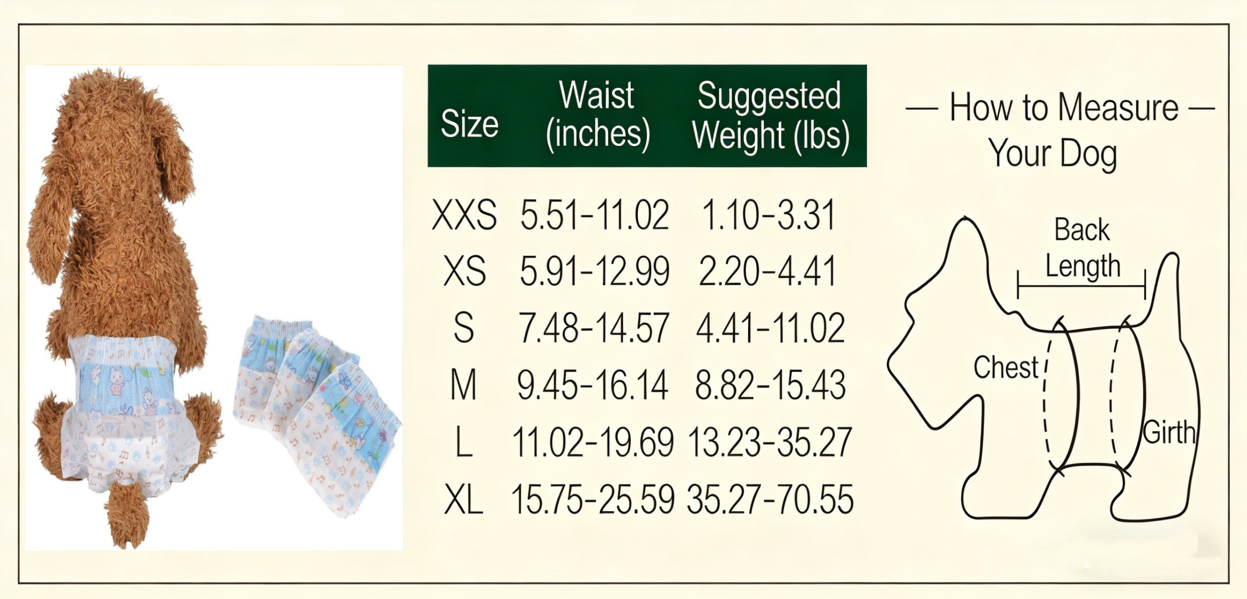 I have been ordering these in size XXS for my 3.5 lb toy poodle for about 2 years now and I am absolutely pleased with these. I will only order these now, they fit and hold up well and are super cute too! They look like actual baby diapers!